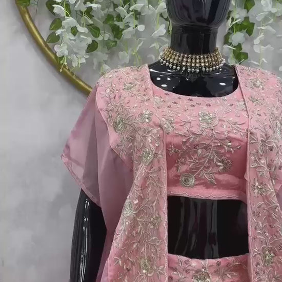 Elegant Pink Chinon Lehenga Choli with Shrug | Thread & Sequin Work | Semi-Stitched | Up to Size 44