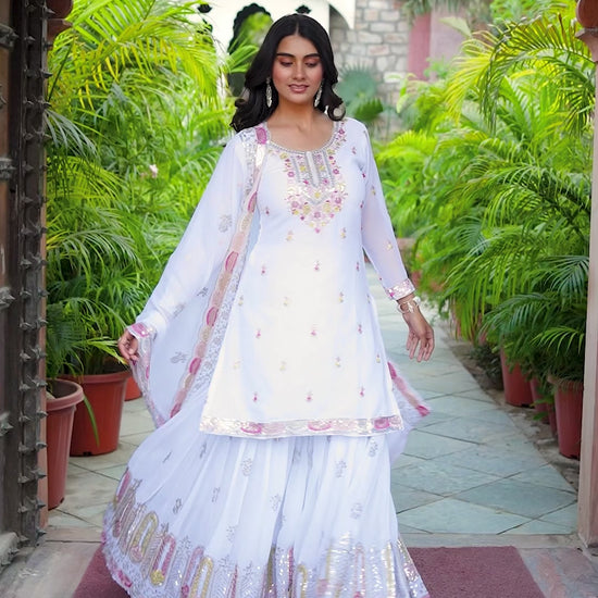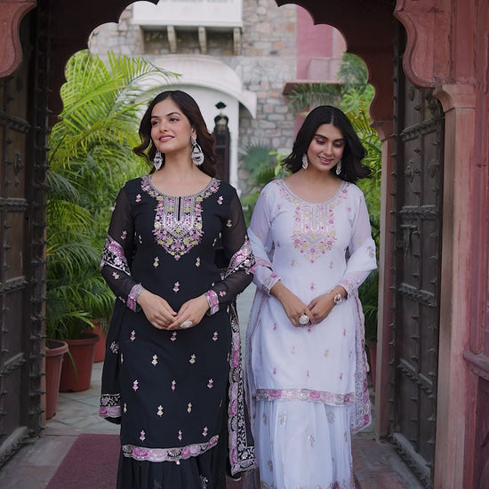 Faux Georgette Embroidered Top & Sharara Set with Dupatta | Front & Back Work | 3-Piece Ethnic Outfit