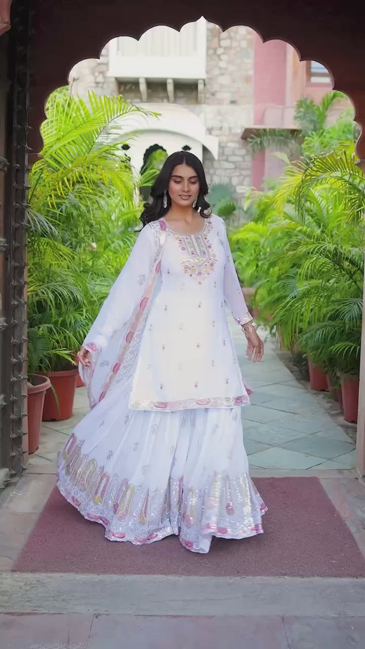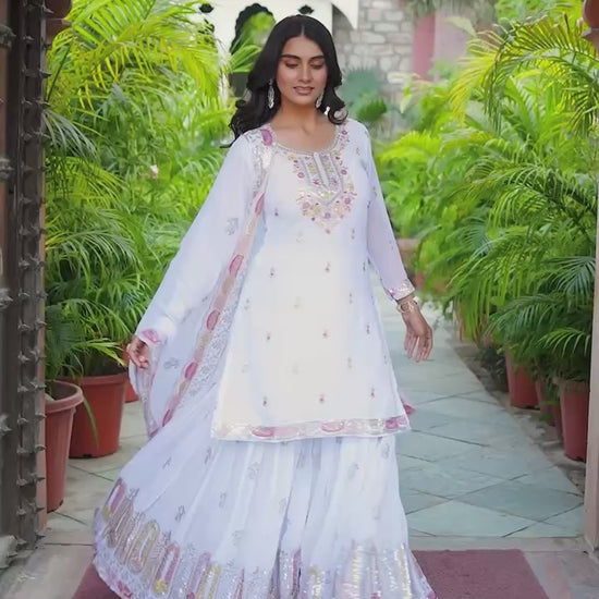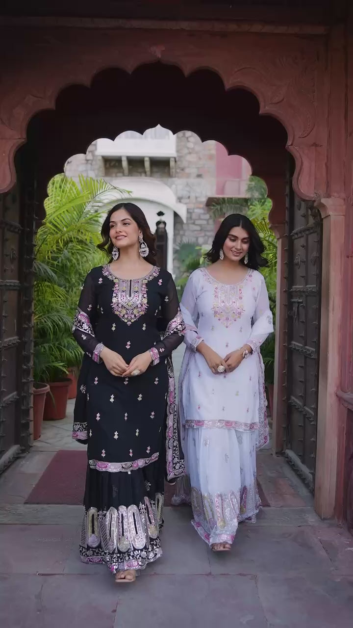 Step into elegance with this premium Faux Georgette Top & Sharara Set, beautifully adorned with thread and sequin embroidery on both front and back. Perfect for weddings, parties, and festive occasions.