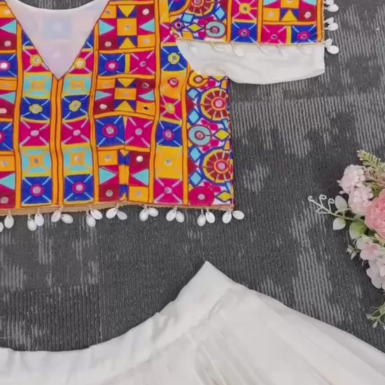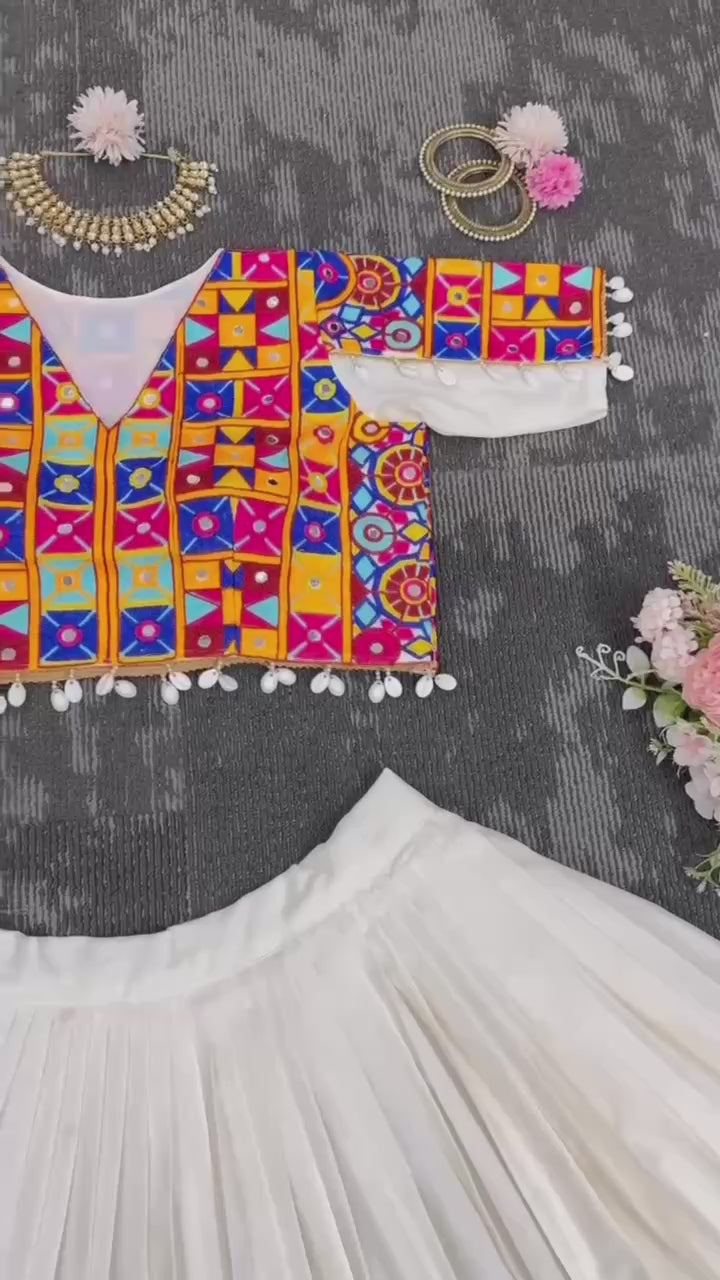 Work: Chinestitch with real mirror work & kodi lace border