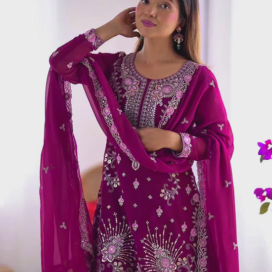 Turn heads with this luxurious Faux Georgette Sharara Set, adorned with intricate thread and sequin embroidery on both front and back. Lightweight yet richly detailed, this set blends modern elegance with traditional charm — perfect for festive celebrations, weddings, and parties.